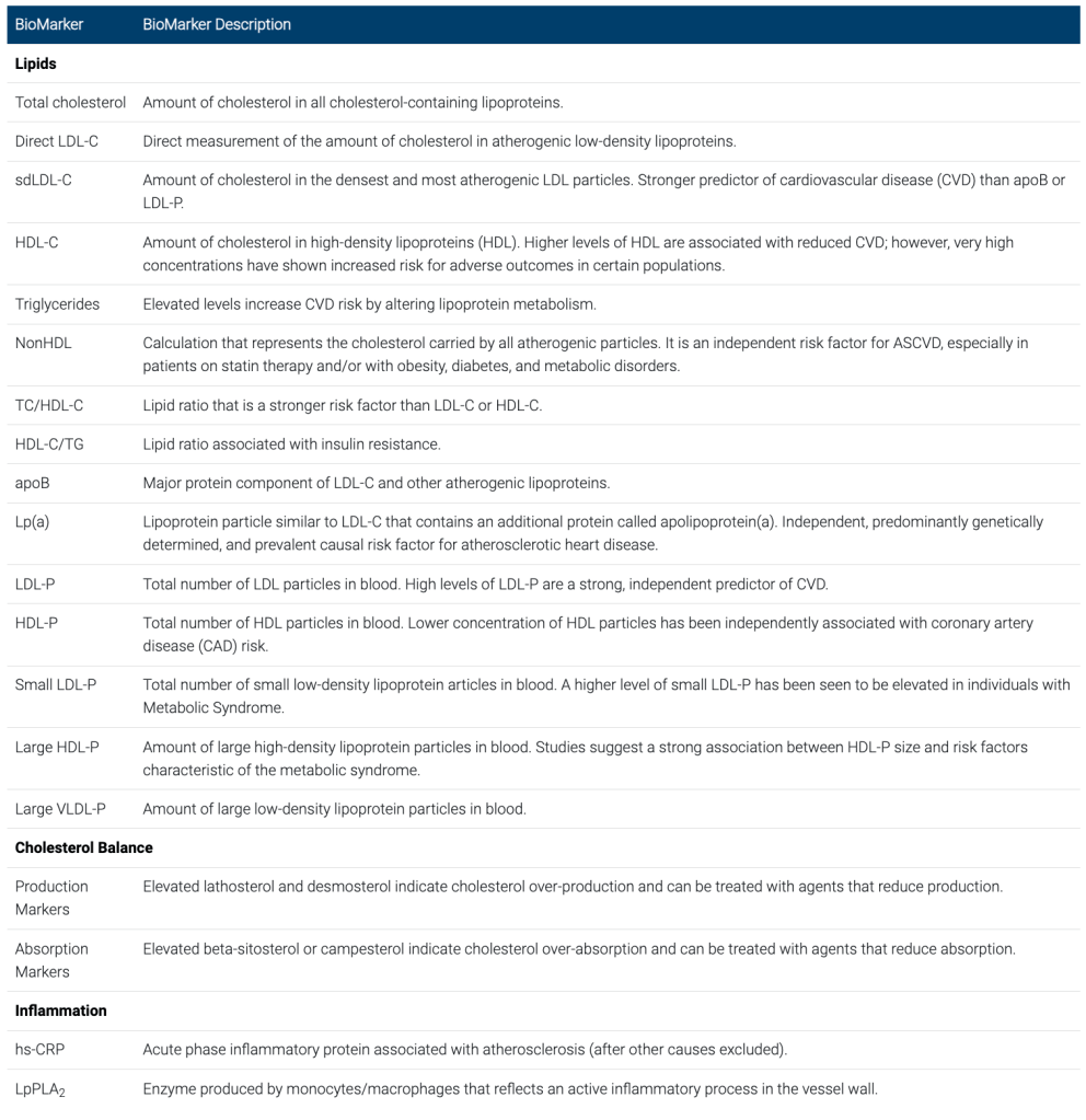 Our testing looks at over 24 biomarkers including Lipids, Inflammation, Cholesterol Balance, and Insulin Resistance.