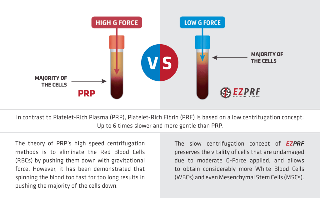 You may have heard of PRP – platelet rich plasma. PRP uses a higher centrifuge force to remove the red blood cells but also may mean removing some other valuable cells. PRF uses a slower centrifugation to allow the specimen to obtain more white blood cells and mesenchymal stem cells. It is also free of additives and anti-coagulants, which allows creation of a fibrin scaffold, and basically allows a slower release of growth factors over 7-10 days as opposed to a few hours with PRF. It can be used on the scalp, the face, and so many other places. Platelet rich plasma and platelet rich fibrin is used in dentistry, orthopedics and other specialties. We are proud to use the EZPRF system.